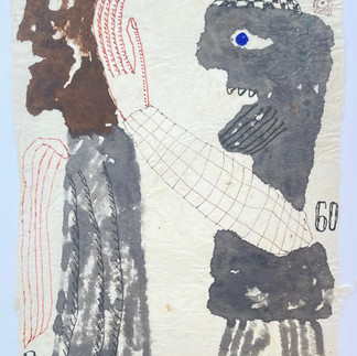 La violence y est présente, mais sans pathos : elle apparaît presque banalisée, intégrée au décor du monde moderne. L’humour noir agit comme une stratégie de survie face à l’absurde. Le papier fragile, parfois irrégulier, renforce l’idée d’une œuvre précaire, exposée, vulnérable.